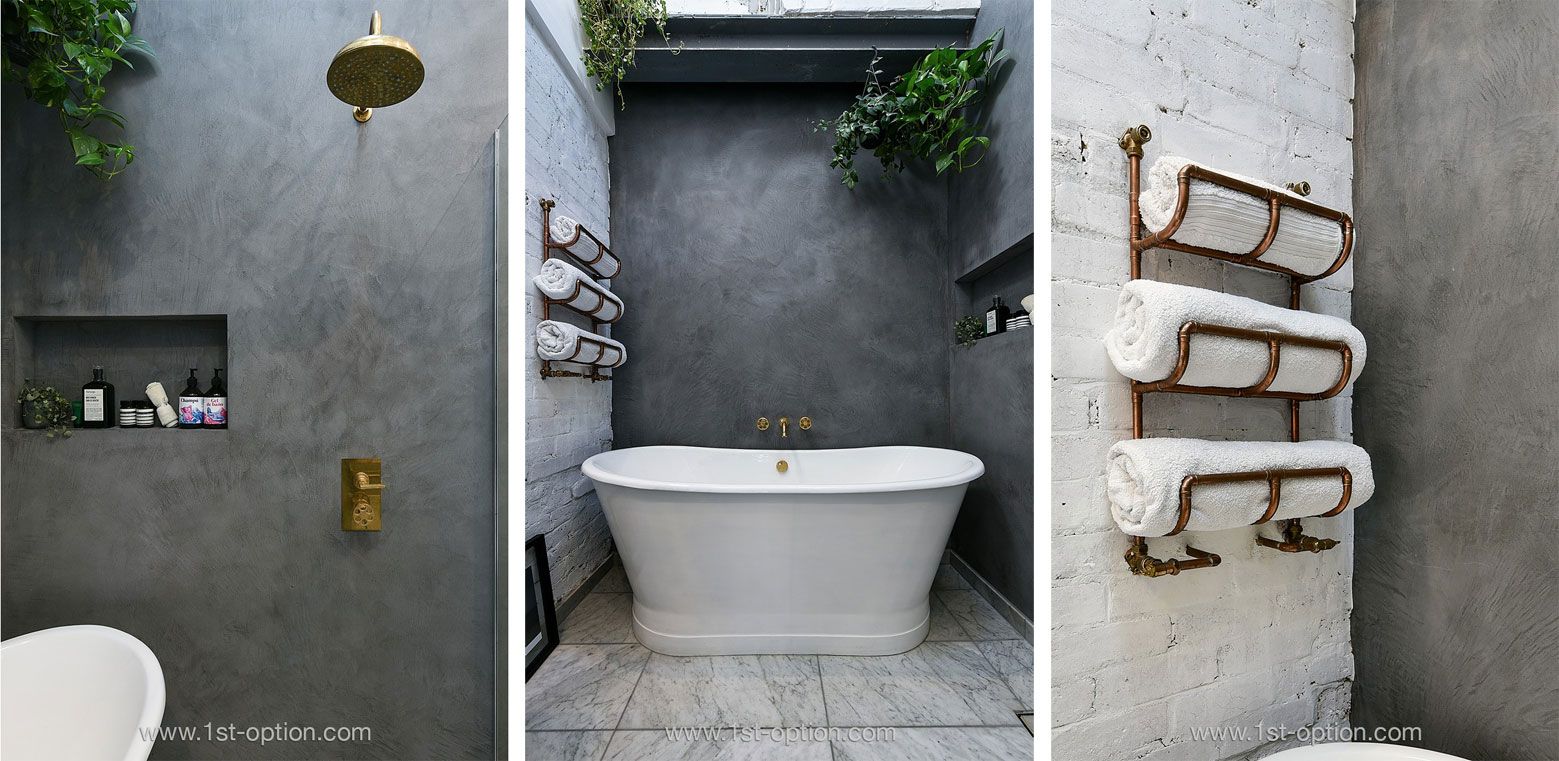 Onto London and we find Nash, a lovely contemporary property with a Scandi vibe. Nash’s bathroom features exposed white brick and contrasting grey walls, making it very popular. The copper shower and taps give a modern feel to this unique space.