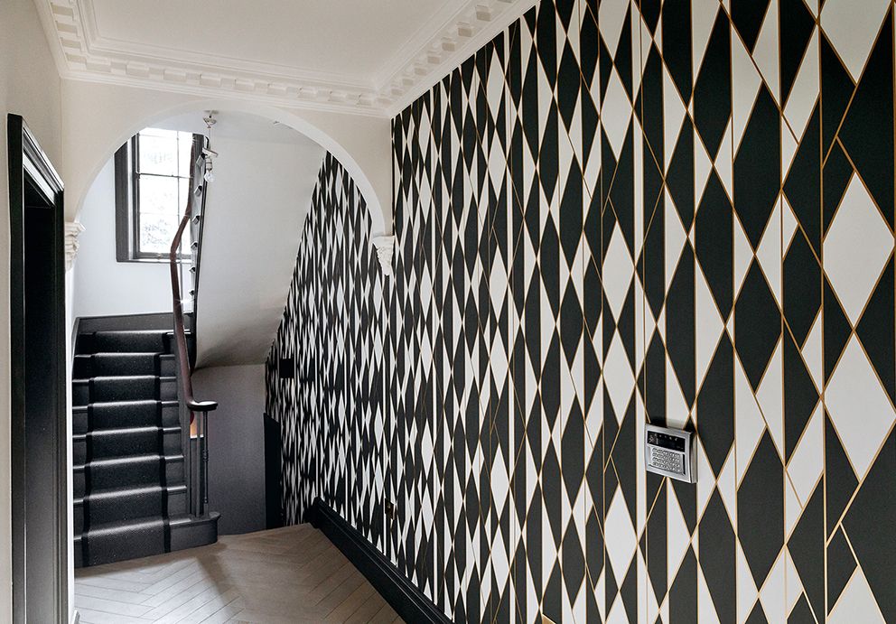 Shepperton – Our new location Shepperton has a distinctly grown-up feel to it. Stepping away from garish florals, the monochrome geometric pattern with gold hints shows us how a feature wall is done.