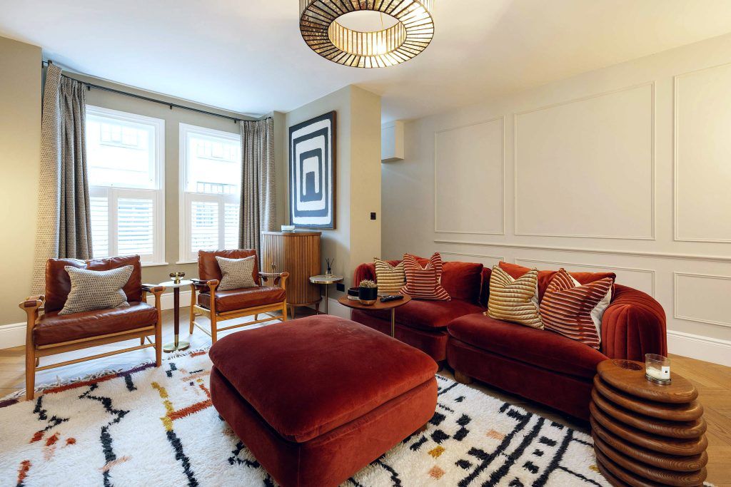 Located in Haggerston, East London, Lace Apartment North is a unique studio with a rich interior design. Featured are two classic leather chairs, placed beside a fireplace and surrounded by deep red tones.