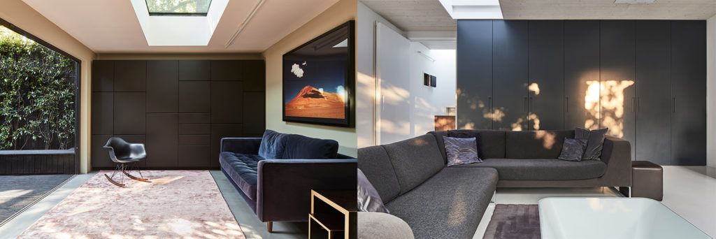 “I also had the dining room table made, as I wanted a simple dark wood table. It’s solid walnut. The kitchen is a grey stained oak by Poliform – they’re an Italian kitchen maker. So there’s a lot of dark wood in the house, the stairs are a dark wood, with a really nice solid feel to them. Jona also made all the cupboards upstairs, which are great for hiding away all our books and things, we do have a fair amount of stuff, it’s just well hidden.”