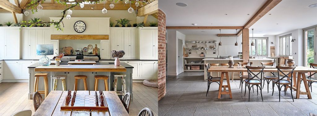 Unlike most other design styles, scratches, scrapes, bumps and nocks are signs of age that are actually sought after and celebrated in modern country design. At the heart of the style is entertaining family and friends, therefore an informal design and layout is key; you do not want your space to feel overly constructed or laid out. In the same way that shabby chic likes its pieces on show to have had a life and tell a story, modern country design dictates that everything in your home shows its personality and character – not to look like it was made for that exact purpose. Kitchens are the hub of a country home and the soul of the kitchen is the kitchen table. A farmhouse kitchen table is a must for any home, the more character and history the better, keep reading for more detail on this later. If you can’t afford to invest in a farmhouse table, drape a checked tablecloth over the table you already have for a cute, country design style hack at minimal cost. Bench seating is perfect for a farmhouse table, it’s bang on trend and gives that informality you are after.