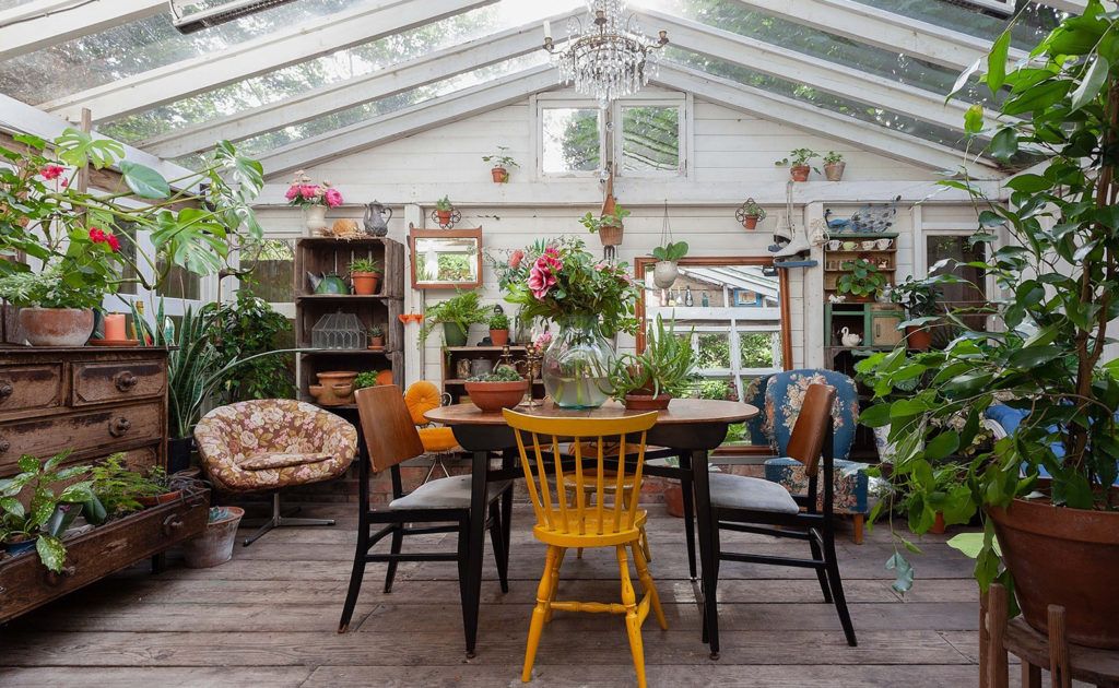 Owned by a photographer, Bromley House is a lovely eclectic shabby chic style shoot location in South London. As well as strategic use of plants inside the house, the jewel in this property’s crown is the lovely summerhouse/conservatory which can be found in the garden. This wonderful creative space is infused with greenery, providing the perfect place to be surrounded by the calming effects of nature while being protected from the perils of the UK’s weather quirks.