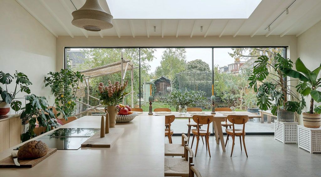Casa’s kitchen area is an impressive space with a Japandi-meets-Moroccan styled open-plan layout. This part of this East London house is neutral and warm in tone and is brought to life with the subtle use of plants along its edges. Having the full-width floor-to-ceiling glass doors looking onto the garden, the plants help to give the effect of the garden being an extension of the living space, allowing you to feel as though you are living outside when you’re in!