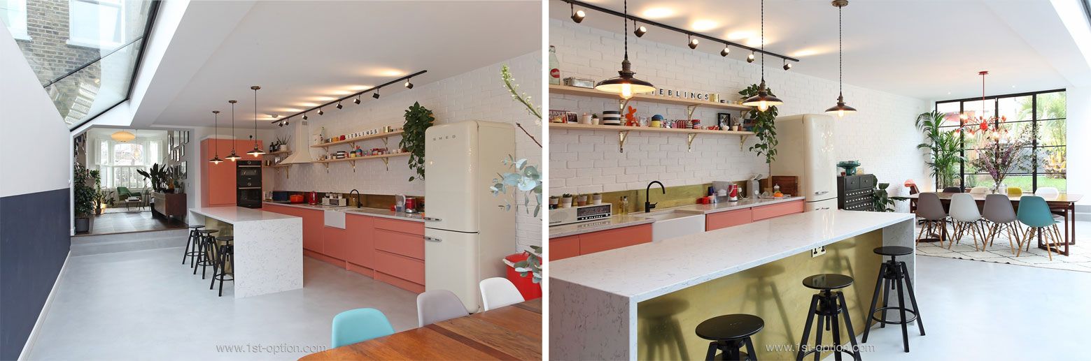 With concrete white floors and bare walls, we get a real Scandi feel in Billie’s kitchen. We can’t get enough of the quirky features from the pink kitchen cabinets to the hanging lights, it really is a perfect home for a modern family shoot!