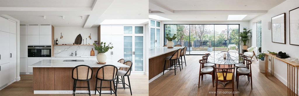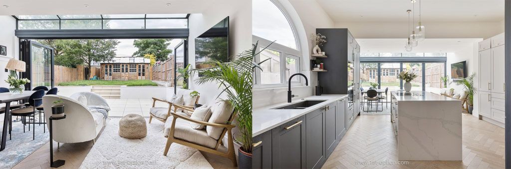 Moving across the capital, our second location this month is Daws – a beautiful and modern family home, based in North West London. The standout area within this contemporary Scandi shoot location is the open-plan kitchen/ living/ dining room. An inside/ outside aesthetic is felt here, with bi-folding glass doors, a large patio, garden and summer house. The Interiors give off a definitive contemporary take on a Scandi design, thanks to the light and airy feel, natural materials and pared back furnishings. These elegantly complement the striking features that include parquet flooring, marble countertops, wooden furniture, biophilia, crittal doors, original cornicing, ceiling roses, fireplaces and wallpapered areas. If you’re looking for a refined family home with pops of colour and character, Daws may be ideal for you.