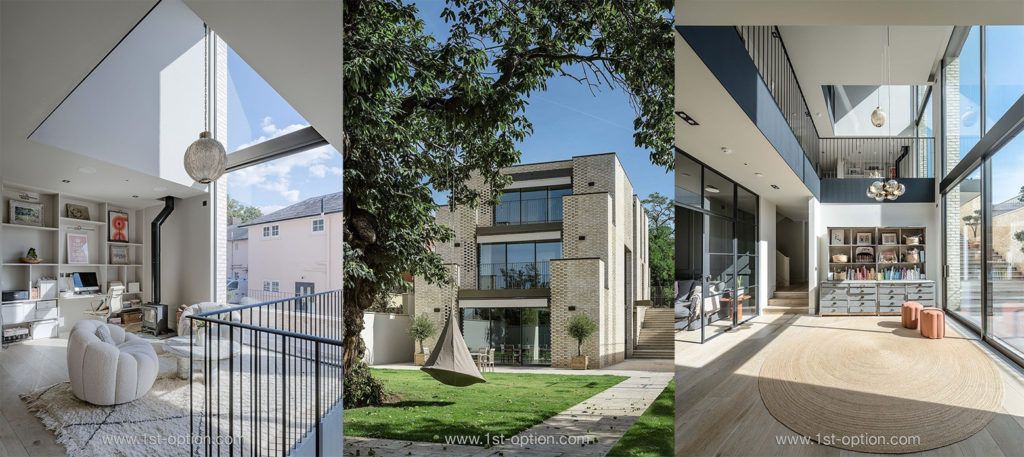 Situated atop a hill in affluent Wimbledon, our first location to make the list is Celeste, an incredibly unique architect-designed new build with a contemporary exterior and timeless interior. From the moment you lay eyes on Celeste’s exterior, you know it’s going to be a showstopper, and the interior leaves nothing to be desired either – a contemporary masterpiece with fantastic design features. Uniquely designed, all three floors are linked through connecting voids, double and triple height ceilings, a one-of-a-kind central staircase and floor-to-ceiling windows that immerse the space with natural light. Premium features are a running theme at Celeste, with the ground floor offering an incredible kitchen/ diner with marble island, wooden flooring, wood panelling, bi-fold doors and views up through the house. Moving through the property, design features that set it apart are still on show, with living spaces on the first and second floor, finished with heaps of natural light, earth tones, more simple wood panelling, and a mixture of antique and modern furniture. There’s also a bang-on-trend wood burner, crittal doors and outstanding views, adding to the personality and drama of the space.
