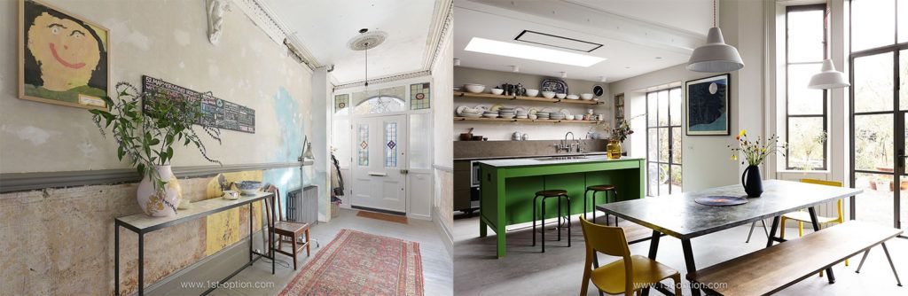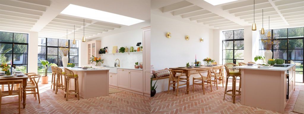 When you think of trendy properties, your brain will most likely go to Pinterest, so it makes sense to include one of the most Pinterest-ready locations you’re likely to see this year. Terracotta is a fabulously designed period house, hailing from Clapham South. While we have many period homes on our books that could have made the list, Terracotta makes it for three distinct areas, – the hallway, front room and the exceptional kitchen/ dining room. Enter through the hallway to find a superb geometric green tiled hallway that perfectly complements the black painted bannister and door frames. Neighbouring the hallway is the living room, a striking space finished with another shade of green – in here you can expect to find washed parquet flooring, bay windows, designer lighting, an original fireplace and a wealth of biophilia that adds visual weight and depth. The jewel in Terracotta’s crown, however, is the rear extension that houses the kitchen/ dining room. The first thing that catches your eye will undoubtedly be the incredibly unique herringbone brick flooring, however, the whole room is elegantly designed and perfectly tied together. Notable elements that make this a perfect shoot location include the pastel pink kitchen units, complemented effortlessly by gold fittings, the wooden ceiling beams, the crittal doors, the marble countertops and the well-placed houseplants that bring a sense of character to the otherwise exquisitely styled room.