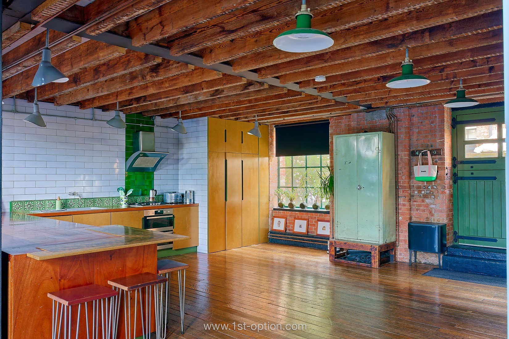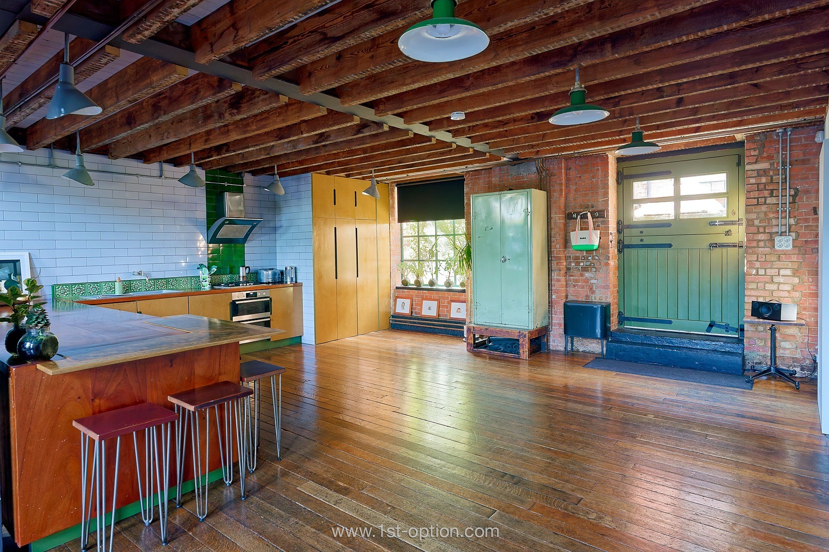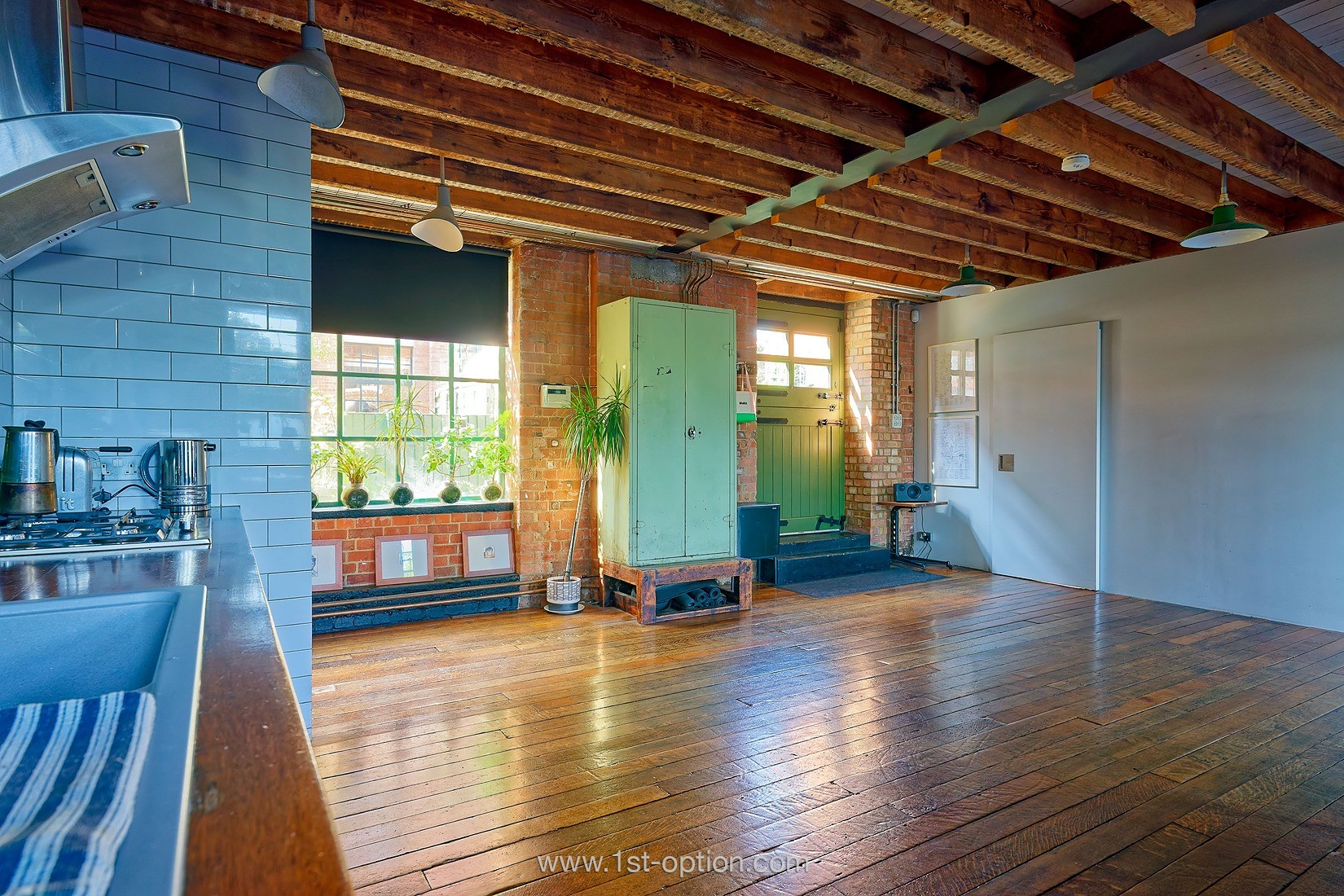 Wooden beams cover the ceiling of the kitchen area whilst the living area boasts industrial original feature metal beams. Floor to ceiling arch windows flood the space with natural light. A downstairs bathroom is also available.