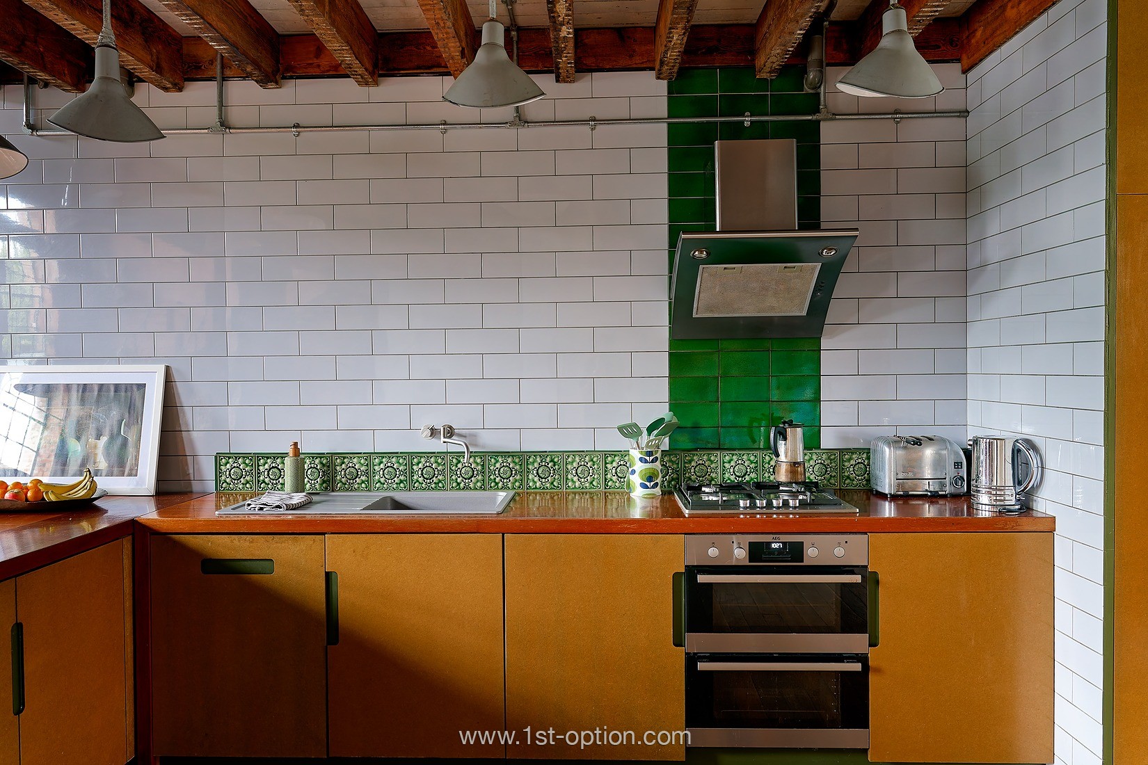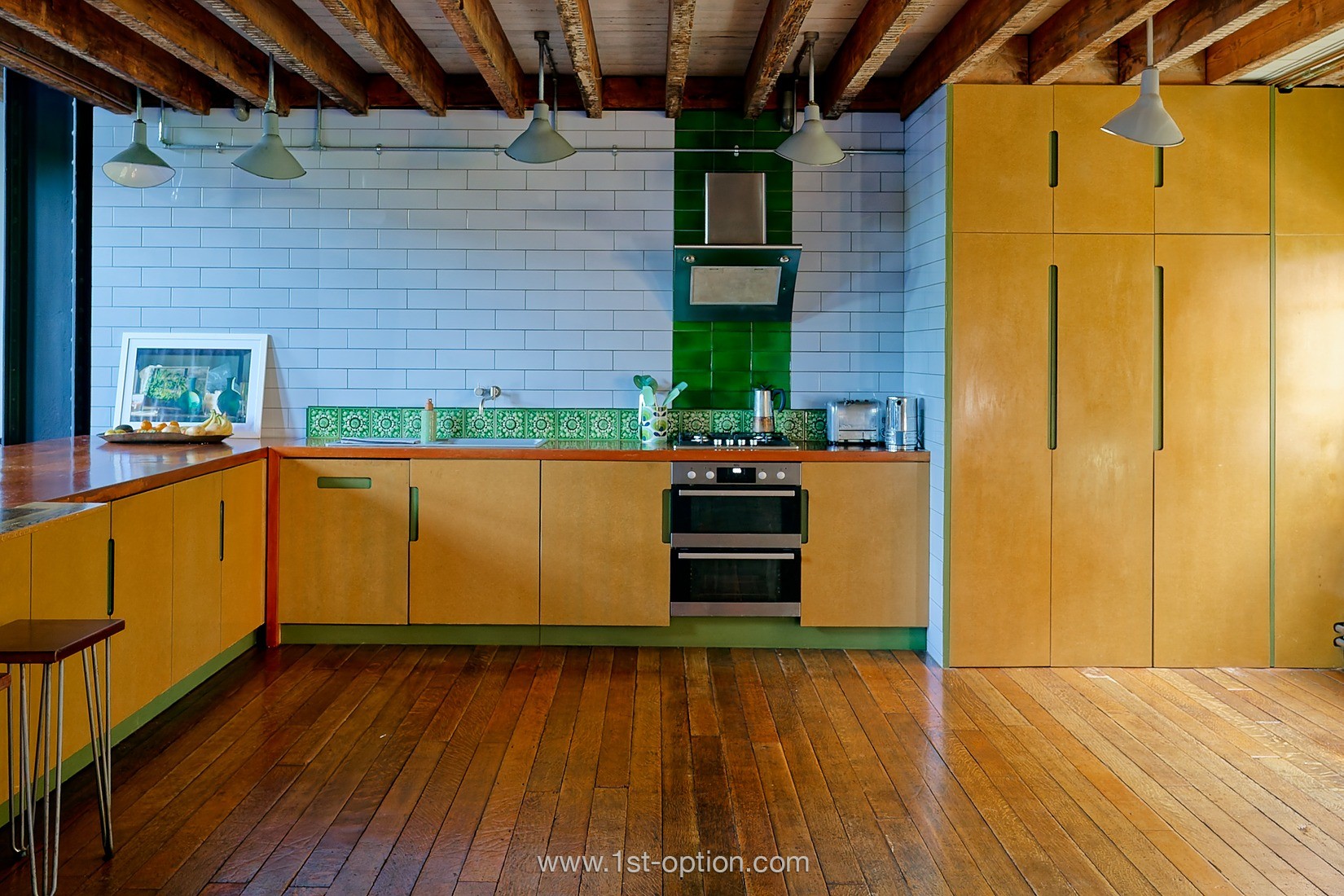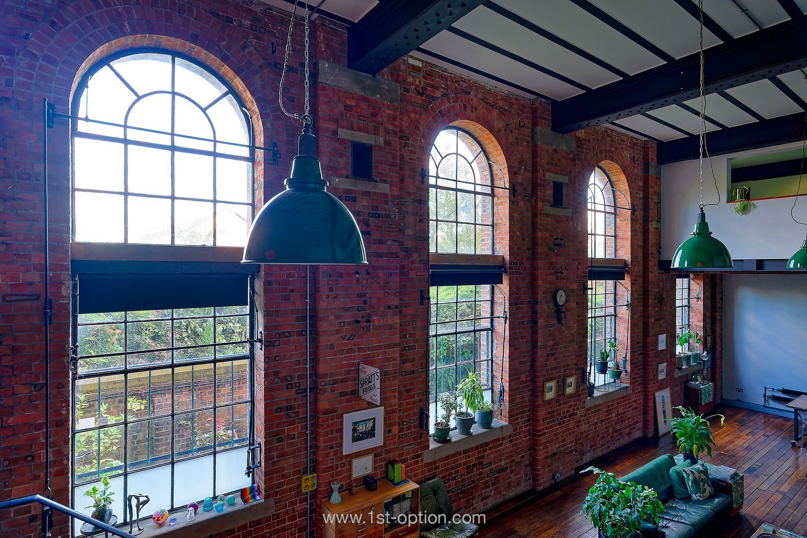 Wooden beams cover the ceiling of the kitchen area whilst the living area boasts industrial original feature metal beams. Floor to ceiling arch windows flood the space with natural light. A downstairs bathroom is also available.